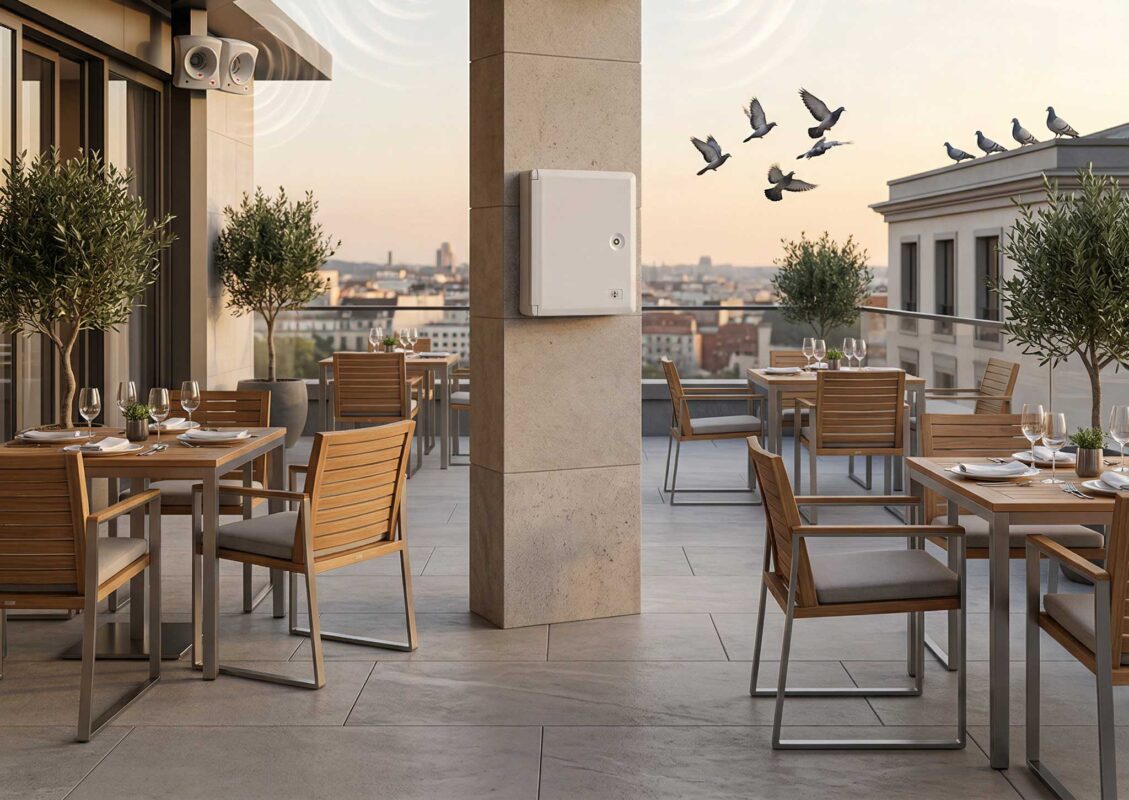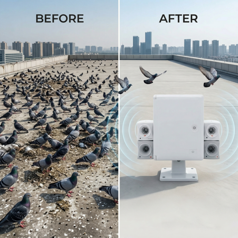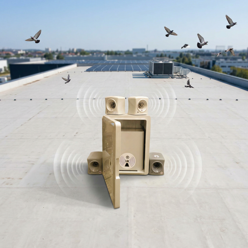 500–2500 m² alanlarda etkili, 4 çıkışlı panel ve ultrasonik hoparlörlerden oluşan profesyonel kuş kovucu sistem.