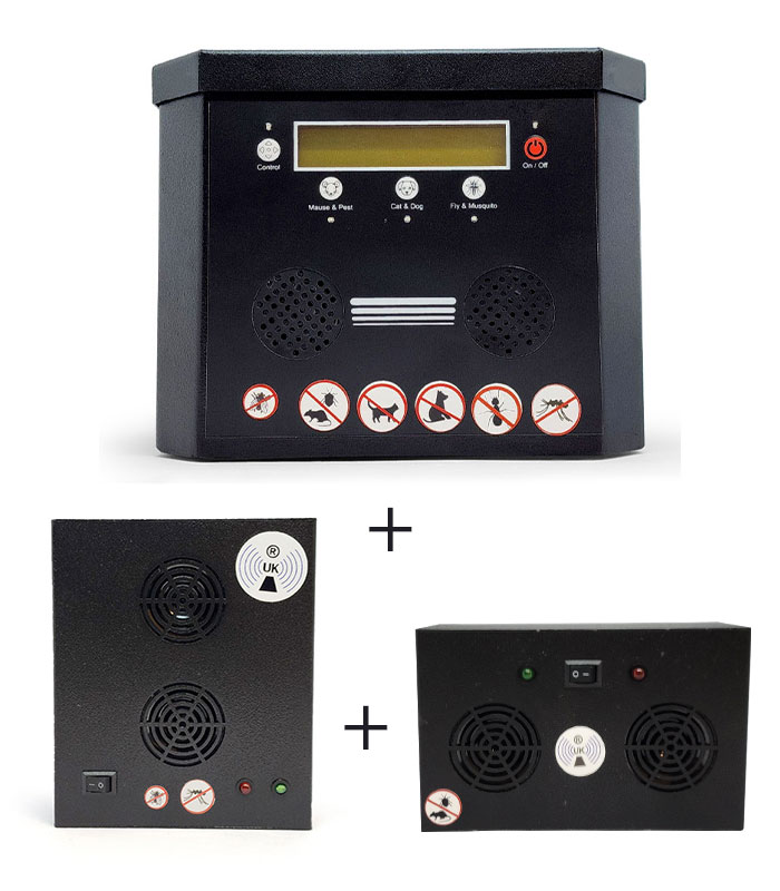 1 adet verici ve 2 adet alıcı cihazdan oluşan bu set, sinyal yayılımını güçlendirerek 500 m²’ye kadar etkili kapsama alanı oluşturur. Özellikle gıda üretim tesislerince tercih edilmektedir. Ev, depo, iş yeri ve geniş alanlarda zararlıların uzaklaştırılmasına yardımcı olur.